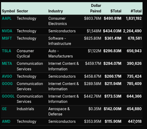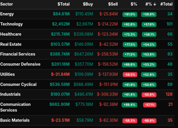 Market-on-Close (MOC) data confirmed strong institutional participation. The 3:51 PM reading showed a $4.79 billion net buy imbalance, with 80% of dollar flow and 52% of symbols leaning to the buy side. The S&P 500 saw 82.1% of its symbols bought, and the Nasdaq 100 an even stronger 90.2%. Leadership came from technology and communication services, led by AAPL (+$490M), NVDA (+$434M), and MSFT (+$361M) buy imbalances. Sector flows reflected aggressive accumulation across tech, financials, and cyclicals, while defensive and utilities sectors faced mild profit-taking.