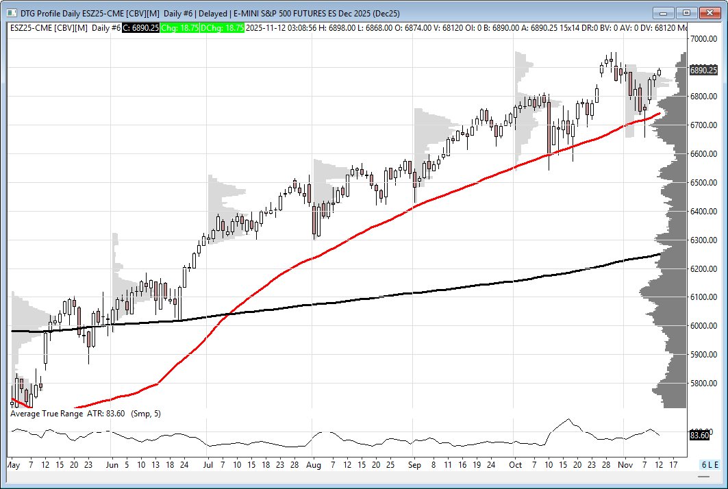 The NQ settled at 25,640.75, down 73.75 points or -0.29%. It made its low on 11/07 at 24,709.25 and a high at 25,768.75 yesterday—a 1,059.50 point rally in two sessions.