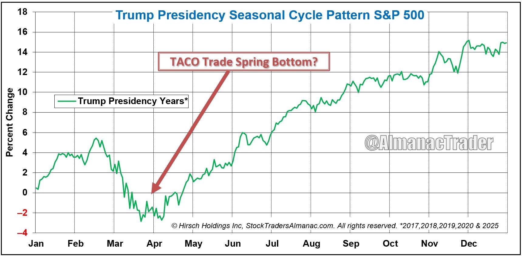 Trump Presidency Seasonal Cycle Pattern: Q1 Shock. Q2-Q4 Awe. Is this another Trump TACO Trade Spring Bottom? Dow Futures up 1,200+ points on Iran deal news this morning. VIX over 30 at the open. And one of the classic TACO trades in recent memory — the 5th biggest 5-minute bar of all time.Five Trump presidency years — 2017, 2018, 2019, 2020, 2025 — same pattern every time: Q1 turbulence, Q2 bottom, then a sustained rally into year-end. Art of the Deal, seasonal edition.#TACO #TACOTrade #TrumpSeasonality #SpringBottom #MarketCycles #Seasonality #StockTradersAlmanac #SPX #VIX #ArtOfTheDeal--