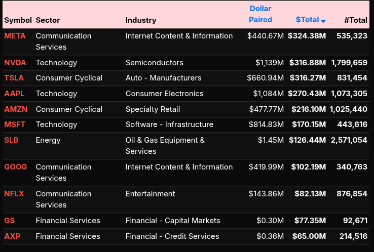 On the symbol level, the sell pressure was concentrated in high-beta and index-heavy names. TSLA (-$316M), NVDA (-$316M), META (-$324M), and AAPL (-$270M) dominated the tape, alongside AMZN and MSFT. This aligns with the Nasdaq imbalance of -76.1%, the most extreme among the indices, confirming tech-led distribution. Financial names like GS and AXP also contributed to the downside.