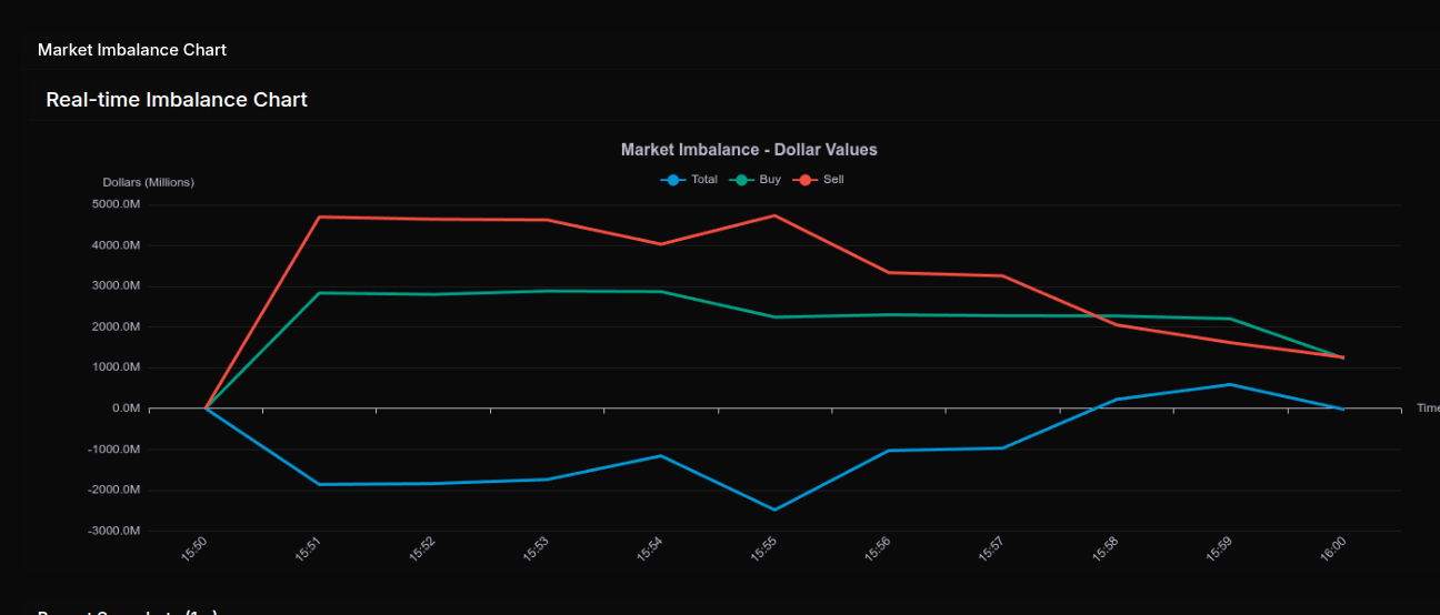 The MOC session opened with immediate and aggressive sell-side pressure, setting the tone for a broadly risk-off close. At 15:51, the market quickly expanded to a -$1.86B imbalance with a -62.4% lean, clearly signaling institutional supply overwhelming demand. This was not rotational activity—this was directional selling. The sell pressure persisted and intensified into 15:55, where the imbalance peaked near -$2.49B and maintained a strong negative skew of -67.9%, confirming sustained program-driven liquidation.