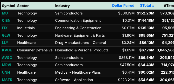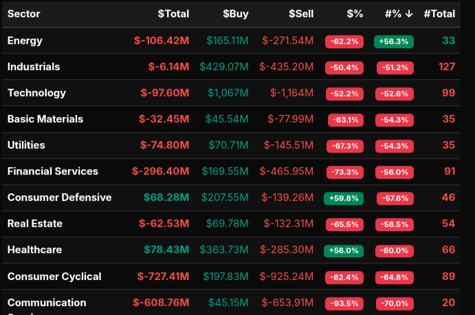 There were pockets of relative strength, but these were more rotational than structural. Healthcare (+56.0%) and Consumer Defensive (+59.8%) saw buy imbalances, though neither exceeded the +66% threshold, suggesting repositioning rather than aggressive accumulation.