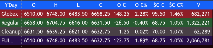 After 4:00, the ES rallied up to 6639.25 at 4:40 and settled at 6634.75, up 75.75 points or 1.15%. The NQ settled at 24,101.50, up 308.50 points or 1.30%, the YM settled at 46,208, up 629 points or 1.38%, and the RTY settled at 2509.60, up 28.40 points or 1.14% on the day.