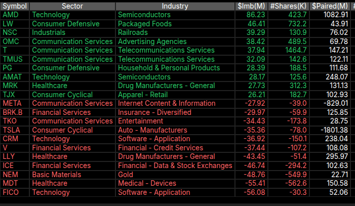 Market-on-Close (MOC) data showed a mild downside bias with a total imbalance of –$396 million to sell, registering a –56% dollar tilt and –52% symbol bias—well short of an extreme. Selling pressure was concentrated in Financials (–$151M), Consumer Cyclicals (–$149M), and Healthcare (–$71M), while Utilities stood out as the only strong buy group (+$36M, +75%). AMD led individual buy imbalances with +$86M, while notable sell programs hit FICO (–$56M), MDT (–$55M), and NEM (–$48M). The late-session weakness coincided with these imbalances but was contained, leaving ES near the upper end of its range to start Tuesday’s trade with a cautiously positive bias.
