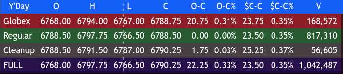 The regular session opened steady at 6788.50 and quickly tested resistance at 6790.25 before sellers took charge. ES fell to its morning low of 6766.50 by 10:10 AM, marking a 23.75-point slide (-0.35%) from the premarket high. Buyers responded with a midday recovery that carried the contract to 6791.75 at 11:55 AM and then 6797.75 at 2:35 PM, the day’s regular-session high. The afternoon, however, was marked by a slow fade: ES slipped back to 6788.25 at 3:30 PM, tested 6787.00 into the 4:00 PM cash close, and finished the cleanup session at 6790.25, up 22.25 points or +0.33% on the day. Total combined volume across sessions was moderate at 1.04 million contracts.