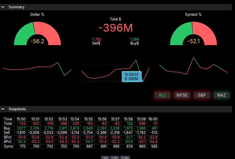 MOC Sell was reported at $338M, which David jokingly referred to as "Mice Nutz" — indicating minimal significance.