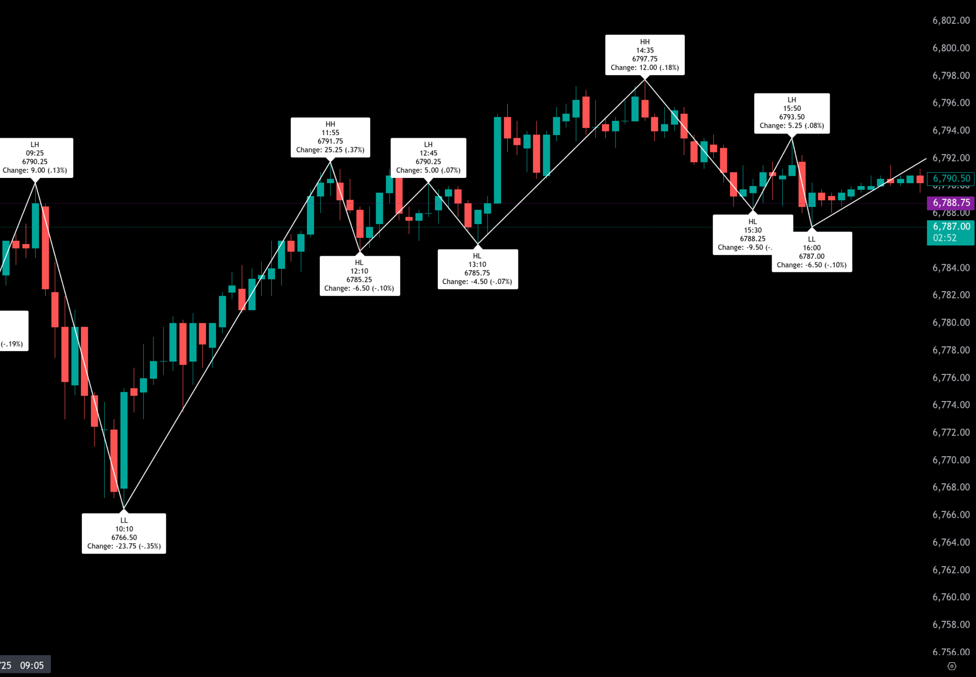 Price tagged 6794, followed by a push to 6800, showcasing strong continuation.