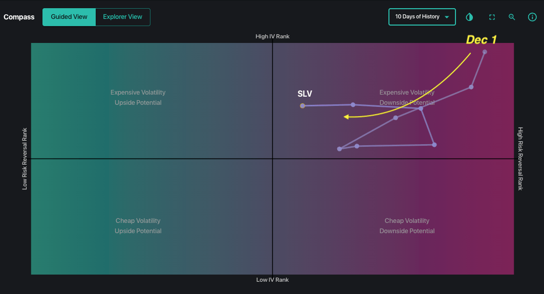 Lastly, we had to bring up silver (again). We discussed put flies into the "Nearly 100% IV Rank" period of 12/1, and that marked a fleeting 1 week period of price consolidation. This admittedly offered a very brief window of put-fly profitability, with our personal put flies currently having negative PNL (for full transparency). In the 3 days since FOMC silver has added another 9% (!), but the SLV vols are doing something quite odd... they are shifting from extreme calls to neutral. That is odd given the 9% rally.