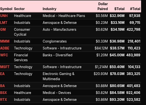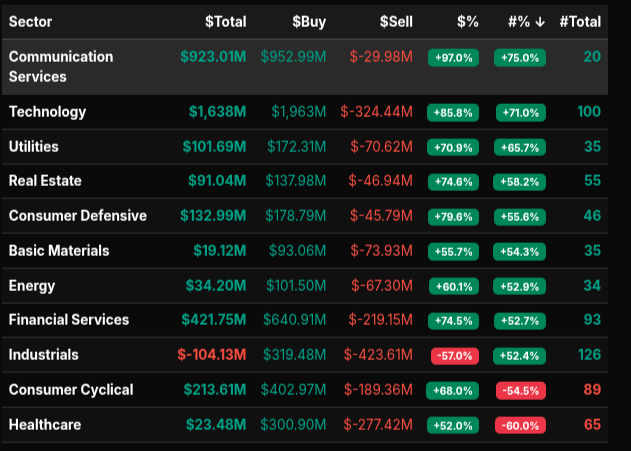 On the flip side, Industrials stood out as the lone sector with a deeply negative dollar imbalance, registering a -57% lean, despite a high symbol count. That divergence highlights heavy selling pressure underneath the surface even as other sectors absorbed capital. Healthcare and Consumer Cyclical also showed mixed behavior, with dollar flows positive earlier but symbol leans slipping below -50%, signaling rotation rather than conviction buying.