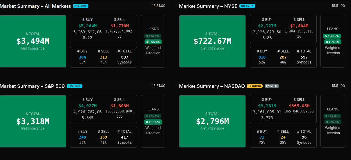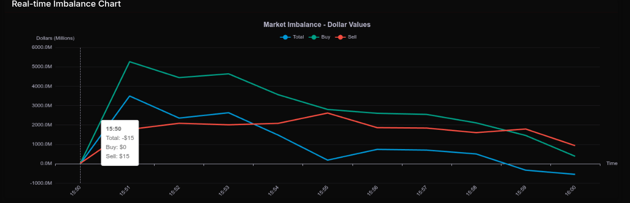 The market-on-close auction opened decisively bid and stayed that way through the bulk of the window, with the first meaningful print at 15:51 showing a strong $3.49B net buy imbalance. From that point forward, buyers clearly controlled the tape, peaking early and then gradually bleeding off into the close as natural offsetting sell interest emerged. The character of the auction was front-loaded, with the most aggressive participation occurring between 15:51 and 15:53 before momentum slowed and rotation took hold.