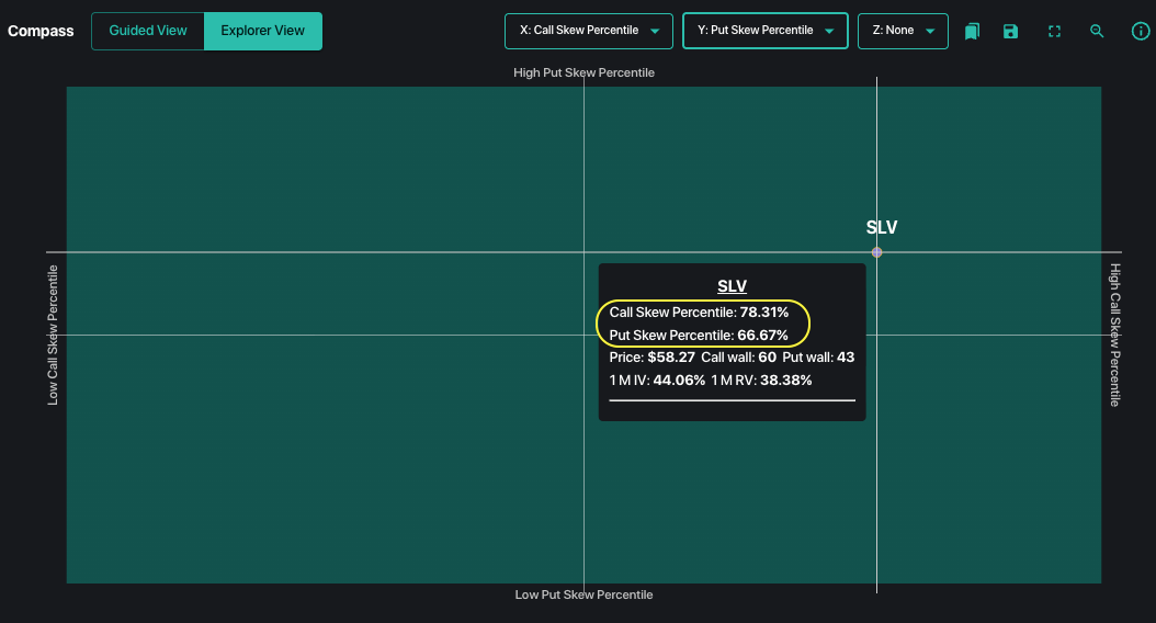 Changing the grid to Call Skew vs Put Skew, we see can see those skews are "getting wing", meaning the skews are both rising. This skews rising appears to be from at-the-money IV's declining. Because this is ultimately a commodity (which can have different vol drivers & characteristics from stocks), we are going to pause from speculating on why those ATM IV's are dropping, but its interesting given the 9% move higher, and suggests that maybe some larger players are starting to monetize this move and/or play the very high vols. Maybe its time for SLV to take a pause....