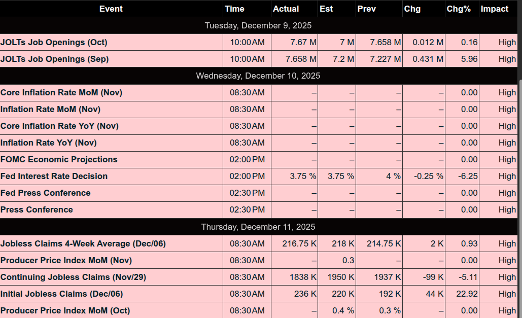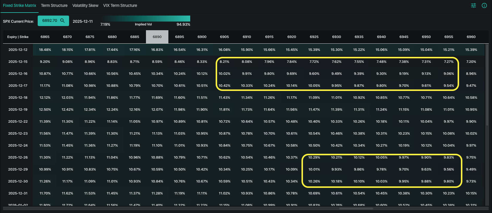 On the topic of IV's, we've essentially hit "Holiday Vols". We had yesterday flagged a swath of "cheap" ~10% IV's around 20-25 delta, and that area has now expanded to include the end-of-year options for delta into the 30's. As with yesterday, maybe you don't think the market rallies, and thats fine, but that does not change the fact that these upside strikes are objectively cheap. You can see there is a path of expirations from 12/18 to 12/26 that are not quite as cheap (think "basement vs "sub basement"), and that is due to CPI/NFP plus some expirations.