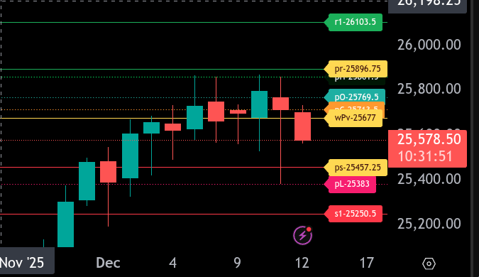 On the upside, initial resistance comes in at 25,713.50 and 25,769.50, followed by 25,861.50. The upper range target for the session sits at 25,896.75. Bulls need a sustained move back above 25,677 to shift momentum toward these levels.