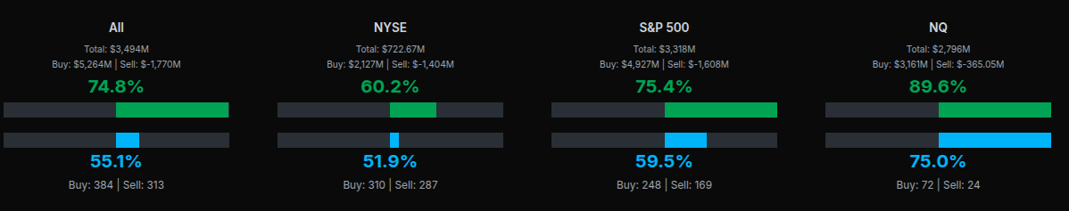 Sector flows tell a clean story of institutional accumulation rather than random rebalancing. Communication Services and Technology led the auction, each posting buy-side leans well above +70%, with Communication Services reaching +97% dollar imbalance — a textbook wholesale buy signal. Utilities, Real Estate, Consumer Defensive, and Financial Services also showed strong positive leans in the +70% to +80% range, reinforcing that this was broad, risk-aware allocation rather than a narrow momentum chase. These sectors reflect longer-duration positioning and balance-sheet flows, not just intraday speculation.