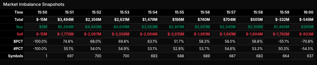 As the clock wound down toward 16:00, the imbalance narrowed and briefly flipped negative, confirming that the auction evolved from aggressive accumulation into orderly digestion. Overall, this was a buy-dominated MOC with clear sector leadership, selective selling pressure, and late-stage rotation — a structure consistent with institutional re-weighting rather than forced flows.