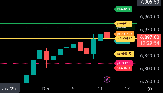 The upper intraday range target is 6940.50. Initial resistance sits at 6907.25, followed by 6928.75. A sustained push through these levels opens the path toward the 6940.50 upper range target.