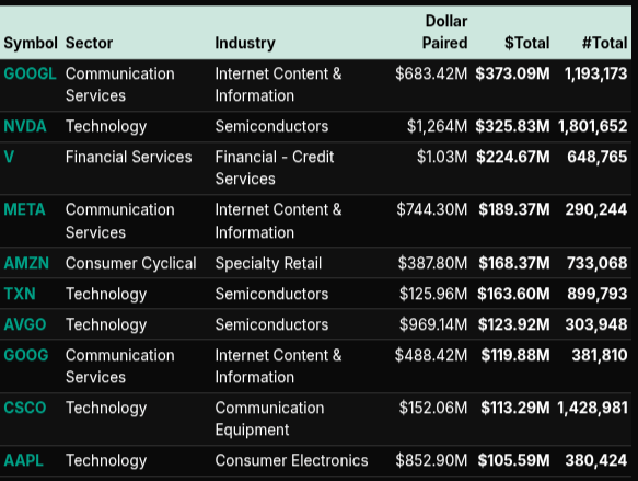 At the single-stock level, mega-cap leadership dominated the tape. MSFT, AAPL, NVDA, GOOGL, META, and AMZN all featured prominently, anchoring the Technology and Communication Services flows. Semiconductor exposure was particularly notable, with NVDA, AVGO, and TXN reinforcing the growth-complex bid. Financial exposure skewed toward credit and large banks, while Aerospace & Defense names like BA and RTX reflected targeted institutional adjustments.
