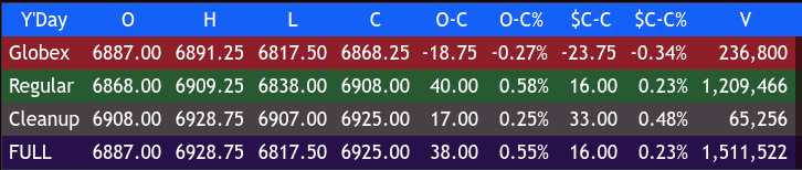 Over the course of the next 2 hours and 10 minutes, the ES rallied all the way up to the old resistance at 6903.00 at 1:40, pulled back to 6895.00 at 1:55, and then started taking out the buy stops above 6900.00, reaching 6909.25 at 2:50. It pulled back to 6896.75 at 3:35 and traded 6899.50 as the 3:50 cash imbalance showed $3.7 billion to buy. It traded 6908.00 on the 4:00 cash close and RIPPED up to a new high at 6924.25 at 4:15, pulled back to 6917.00, and at 4:50 did another RIP up to 6929.00, settling at 6907.25, up 15.50 or +0.22%.