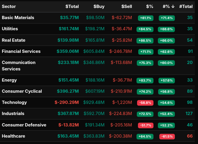 Sector flows reinforced that message. Financial Services, Consumer Cyclical, Industrials, and Communication Services all posted strong positive totals with percentage leans above +70%, pointing to broad risk-on participation. Utilities, Real Estate, and Energy also leaned decisively buy-side, suggesting defensive and yield-sensitive names were not being abandoned. Technology stood out as the exception: despite massive gross flow, the sector finished with a net sell imbalance, reflecting heavy internal rotation rather than outright liquidation. This aligns with the presence of mega-cap tech on both the buy and sell lists.