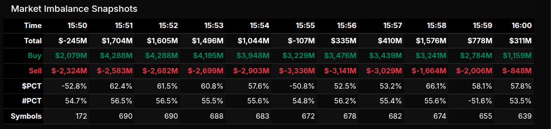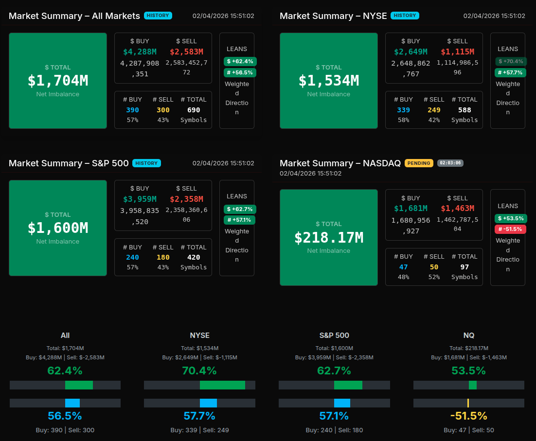 Into the final minutes, the imbalance compressed but remained positive, closing near a $300M net buy. The NYSE and S&P 500 both held strong buy leans above +62%, while Nasdaq lagged, reinforcing the day’s key theme: steady accumulation outside of high-beta tech, with rotation—not panic—driving the close.