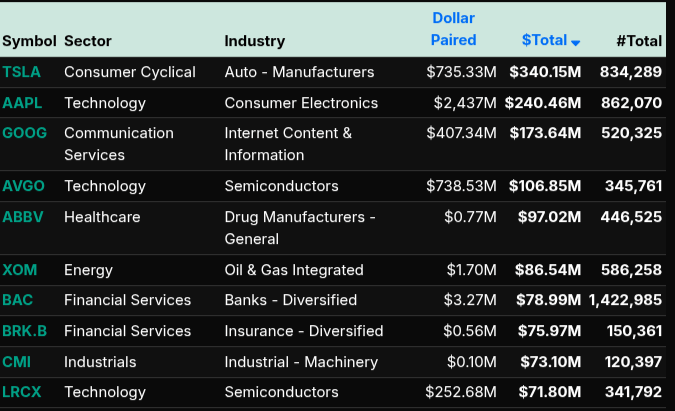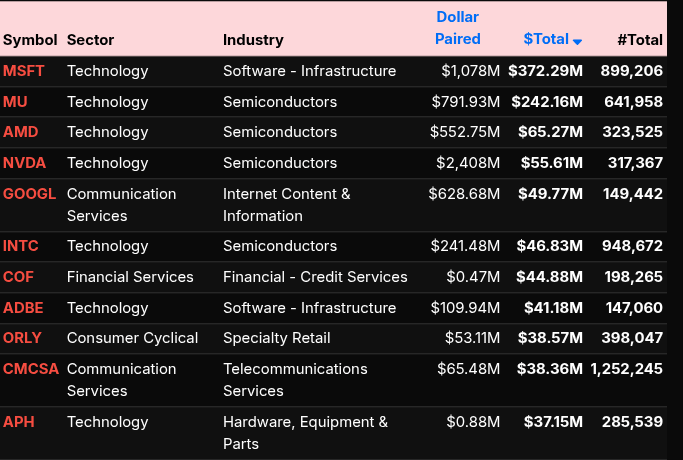 On the single-name level, the close was dominated by large, liquid symbols. MSFT, MU, AMD, NVDA, and AAPL all featured prominently, underscoring institutional rebalancing rather than event-driven spikes. Several of these names showed dollar-paired flows large enough to suggest wholesale execution, even where net results were modest.