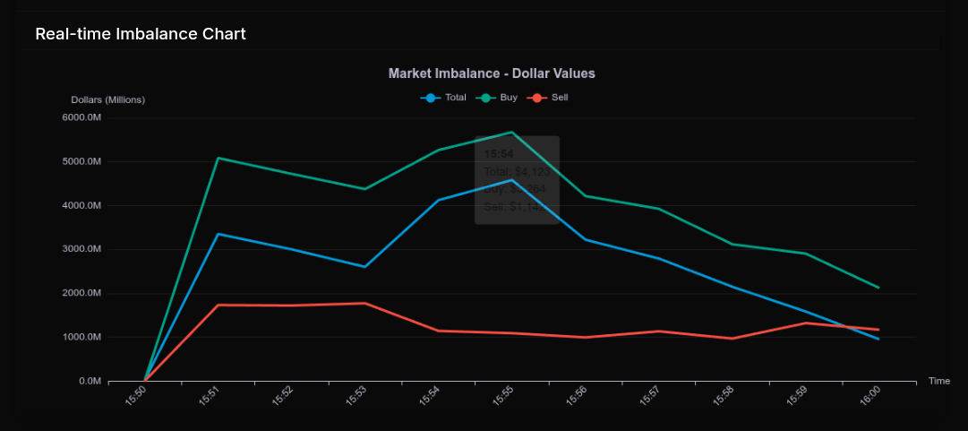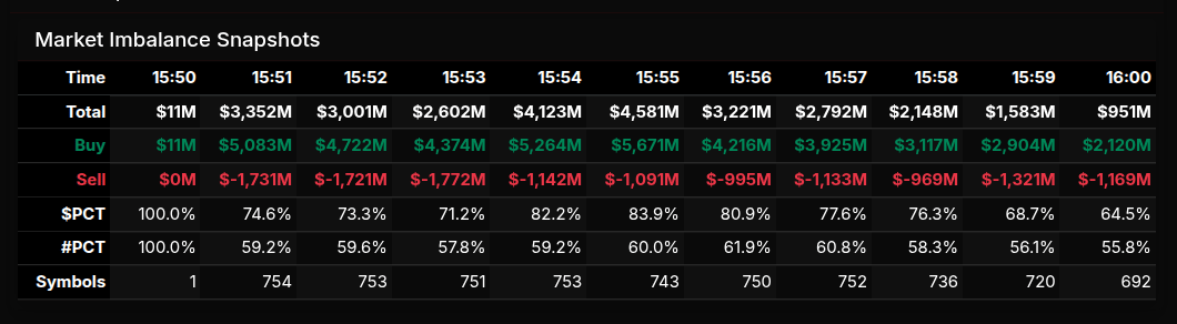 As the session progressed into the final minutes, there was a gradual fade in total imbalance—from the $4B+ range down toward $951M into the close—but importantly, the buy-side dominance remained intact. Even at 16:00, the imbalance still leaned roughly +64.5%, showing that while participation thinned, directional conviction did not fully unwind.