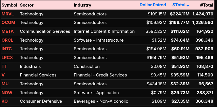 At the symbol level, flows were concentrated in mega-cap leadership. NVDA (+$461M), AMZN (+$331M), AVGO (+$222M), and TSLA (+$218M) led the buy programs, alongside strong participation in GOOG/GOOGL and MSFT. Semiconductors were particularly dominant, with names like MRVL, QCOM, INTC, and LRCX all seeing steady demand. META also stood out on the communication side, reinforcing the tech-heavy bid.