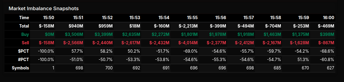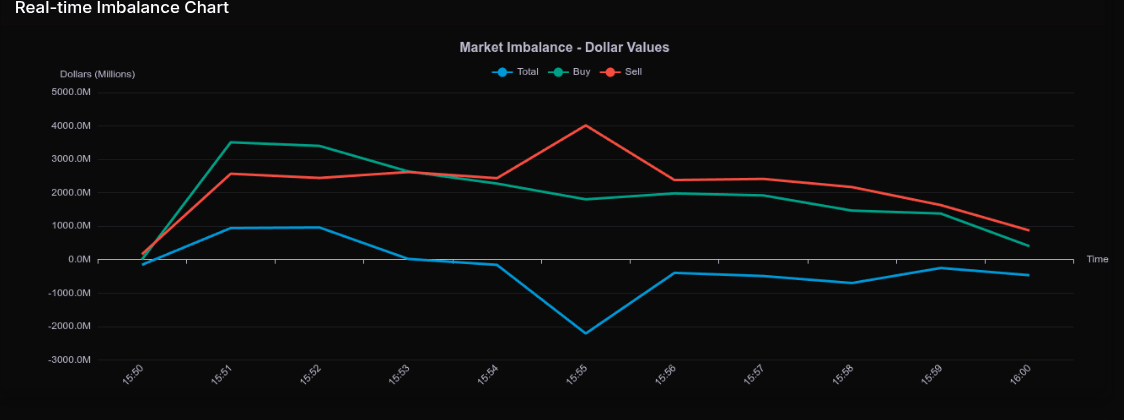From 15:52 to 15:54, buy interest remained elevated—$3.3B, then $2.6B, then $2.2B—yet each minute saw growing sell pressure on the other side. By 15:55, the auction flipped hard: sell imbalances ballooned to –$4.01B, pushing the total to –$2.21B, marking the decisive pivot of the session. This –69% lean signaled broad, wholesale selling. The pressure eased slightly into 15:56–15:59 but remained firmly negative through the close, finishing –$469M at 16:00.
