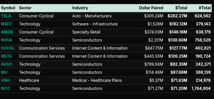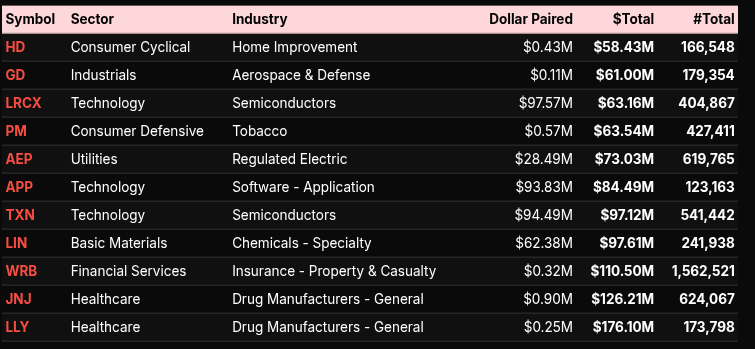 Symbol-level flows showed Technology dominating the buy side—NVDA, AVGO, TXN, INTC, MU all posted large paired values. Mega-cap tech (MSFT, GOOGL, META) added substantial early support. On the sell side, large-cap Healthcare and Financials were notable: LLY, JNJ, WRB, and LIN all carried heavy red totals, indicating targeted liquidation in defensive sectors even while tech was bid.