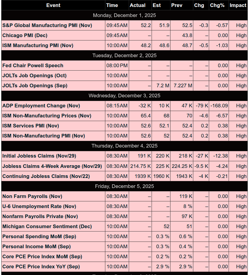 A hotter-than-expected PCE print could challenge 87% odds of a Dec 10 Fed rate cut (per FedWatch).
