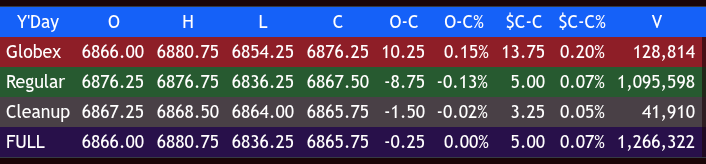 It traded 6854.00 as the 3:50 cash imbalance showed $1 billion to buy, then moved up to 6867.50 at 3:55 and traded 6867.50 on the 4:00 cash close. After 4:00, the ES flatlined in a 3- to 5-point range and settled at 6865.75, down 10.5 points or -0.15%. The NQ settled at 25,632.50, down 15.5 points or -0.06% on the day.
