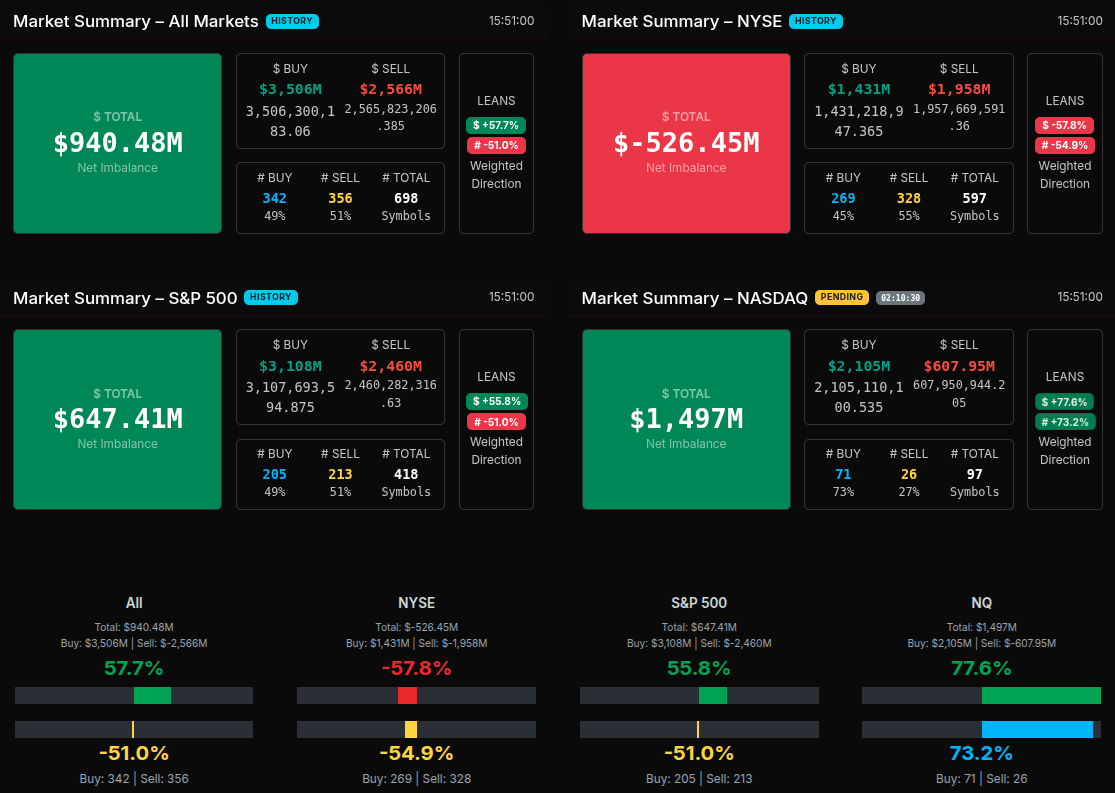 Market-on-Close activity included a $1B buy imbalance that was quickly absorbed, later flipping to a $2.25B sell imbalance.