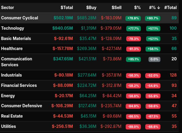 Sector flow confirmed this deterioration. Technology led early with a +77.7% / $940M bid, while Consumer Cyclical posted +60.7% / $502M, supported by TSLA, AMZN, and retail names. Communication Services also held a strong +85% buy lean. But everything else was aggressively offered: Utilities (–89%), Basic Materials (–78%), Industrials (–56%), Financials (–58%), and Healthcare (–61%). Many of these were deep, wholesale-type sells with leans below –66%, consistent with the heavy flip at 15:55.