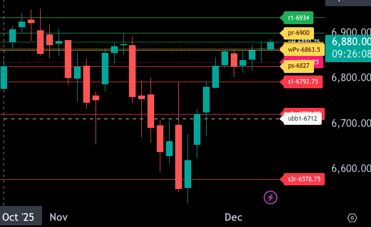 The trend remains constructive above 6863.50, but failure to hold that level would shift momentum back toward the lower supports.