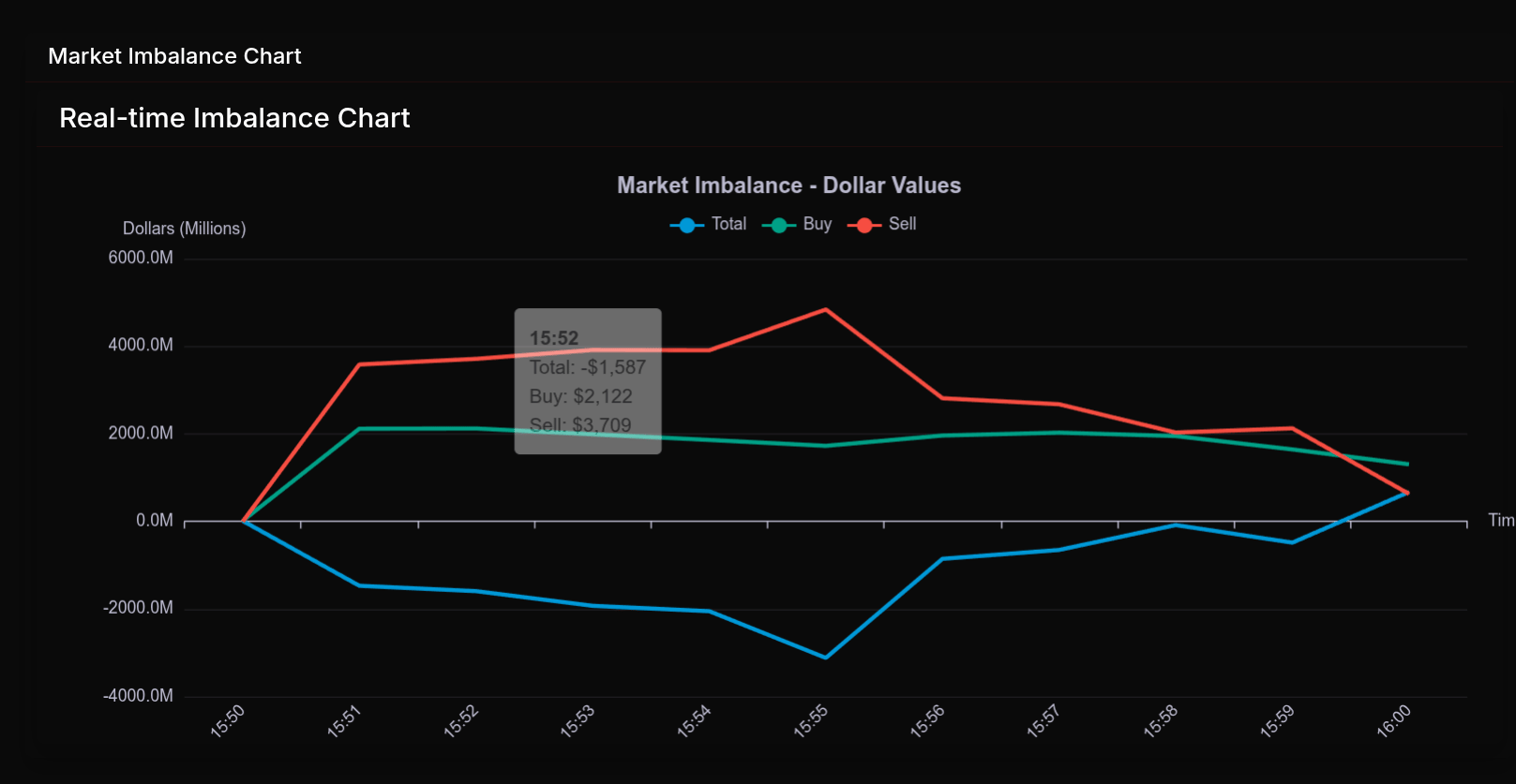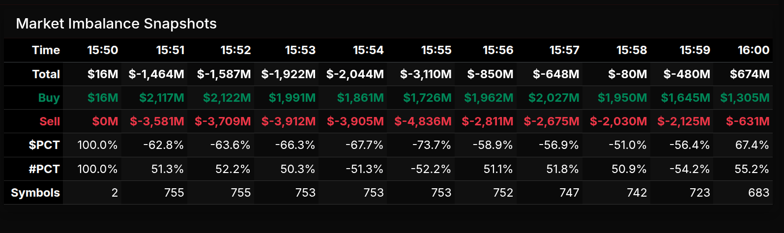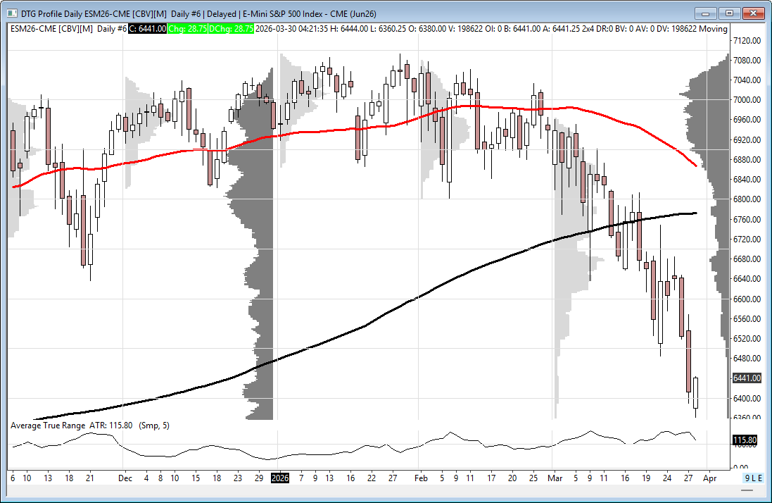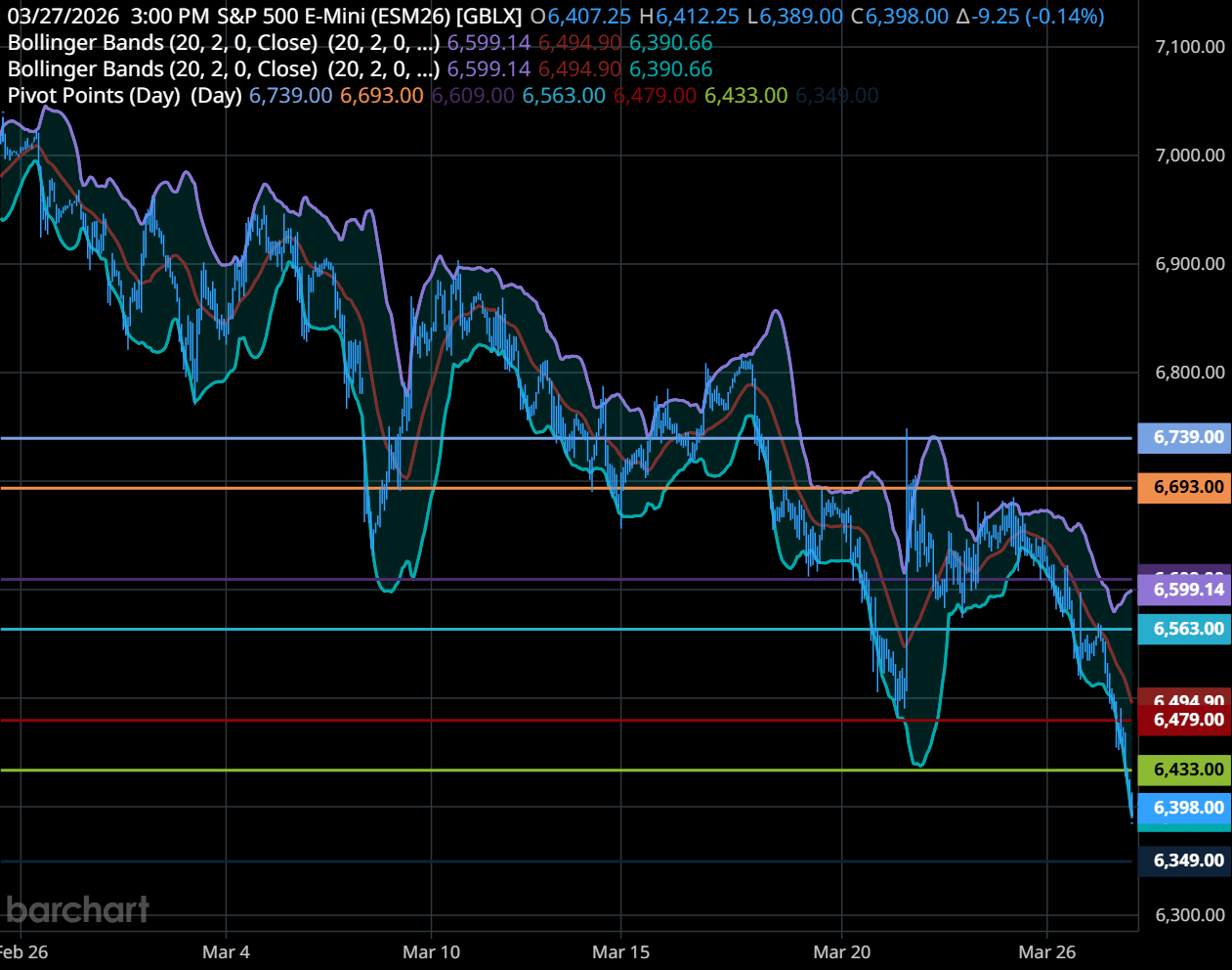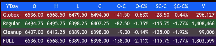 The ES traded 6405.75 as the 3:50 cash imbalance showed $1.43 billion to sell, rallied up to 6419.25 at 3:55, and sold off down to 6407.25 on the 4:00 cash close. After 4:00, the ES traded down to a new low at 6389.00 at 4:20, rallied up to 6401.00, and settled at 6398.00, down 127 points or -1.95%. The NQ settled at 24,254.25, down 431 points or -1.75%, the YM settled at 45,424, down 806 points or -1.74%, and the RTY settled at 2464.00, down 44.20 points or -1.76% on the day.