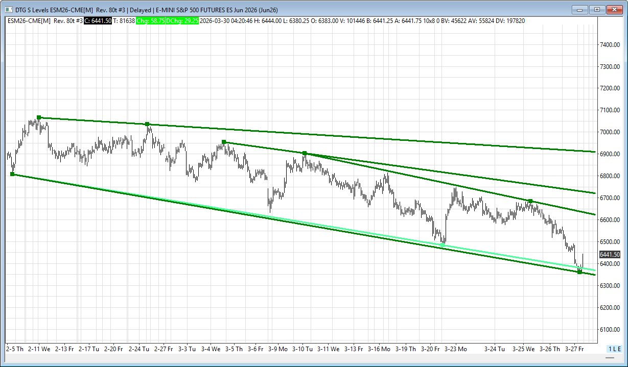 Afer the open, the ES traded 6495.50 marked a morning low at 6451.75 at 10:45. The ES then rallied up to 6481.25 at 11:05 and traded back down to 6457.75 at 11:20. It rallied again to 6490.25 at 11:35, then sold off to new lows at 6419.25 at 2:10. The ES bounced to 6435.25 at 2:20, sold off to 6412.50 at 3:10, and then chopped back and forth until 3:42, when it broke down to new lows at 6398.25 at 3:45.