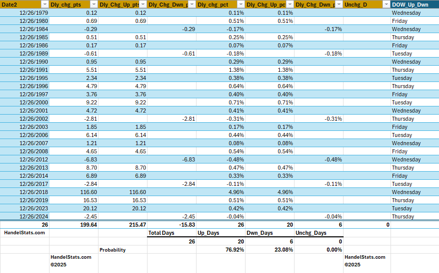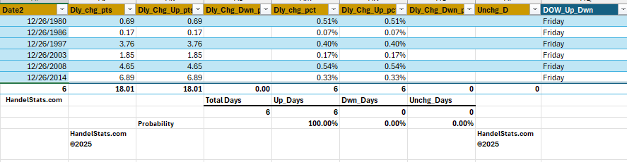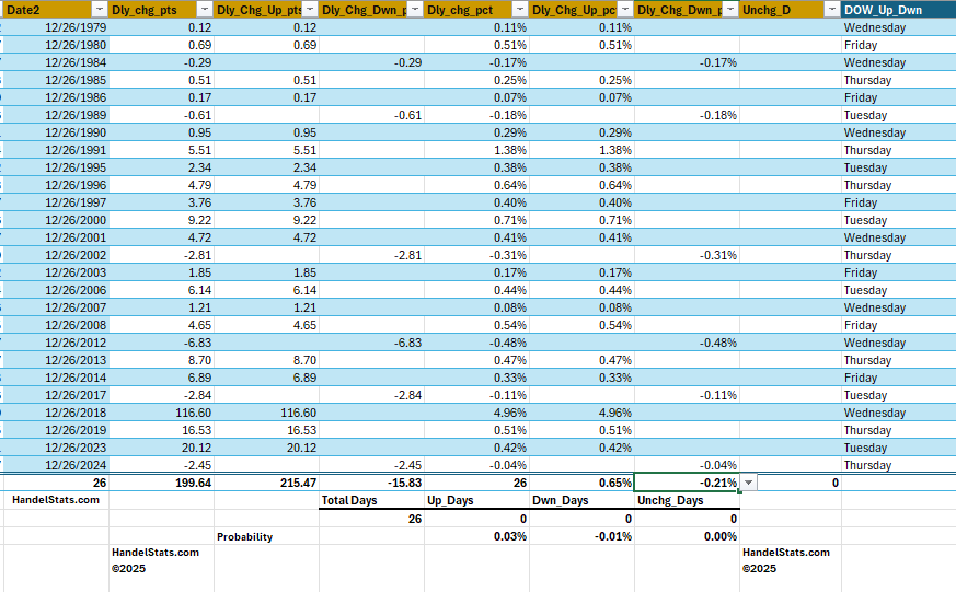 At HandelStats, we analyzed S&P 500 performance when the day after Christmas falls on December 26. Since 1979, there have been 26 such occurrences, with the market closing higher 20 times (76.9%) and lower 6 times, with no unchanged sessions. The average return across all observations is approximately +0.65%, showing a clear bullish seasonal bias. Notably, when December 26 falls on a Friday, the market has finished higher 100% of the time (6 out of 6 occurrences). As always, this is not a trading signal, but a seasonal tendency that helps frame expectations and risk during holiday-thinned sessions.