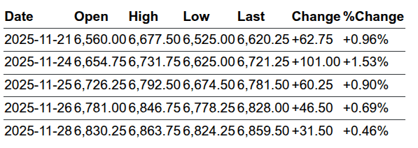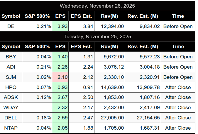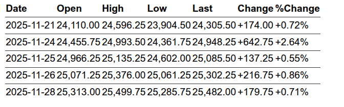 During Friday's holiday extended Globex trade, the CME experienced an outage from a CyrusOne data center cooling failure that halted trading until 8:30 a.m. Friday and thinned post-Thanksgiving volume. Stocks closed at two-week highs and up five sessions in a row. The semiconductors and energy stocks rallied, with WTI crude up over 1%. The big November month-end rebalance, plus the index markets pricing in an 83% probability of a 25 bps Fed rate cut at the December 9–10 FOMC meeting, came even as October jobs and CPI data were scrapped and folded into delayed November reports due December 16 and 18.