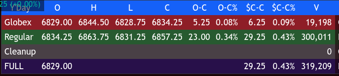 On Wednesday night’s Globex session into Thursday’s Globex session, the ES traded up to 6846.67 and settled at 6828.00, up 46.50 points or +0.69% on a total volume of 1.459 million contracts traded. On Friday, the ES traded up to 6863.75 and settled at 6857.25, up 29.25 points or +0.43%. The NQ settled at 25,085.50, up 131,590 points or +0.55% on the day.