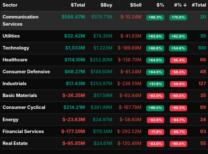 On the sell side, Financial Services (–$177M), Real Estate (–$95M), and Energy (–$23M) showed deep negative leans, with Financials the standout at –71.8%, indicating broad liquidation.