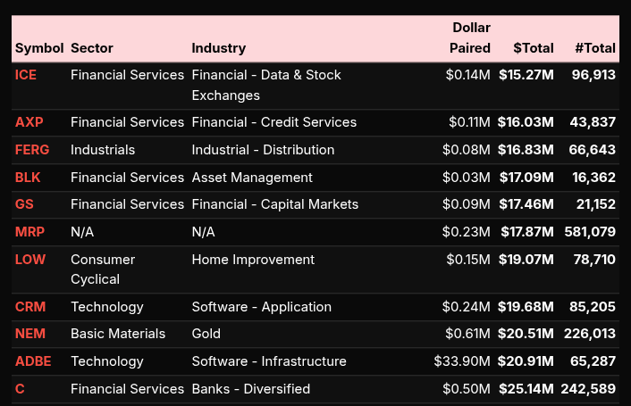 Across the major groups, the S&P 500 showed the strongest and most persistent appetite, opening at $2.913B buy vs. $1.018B sell, a 74% lean — a decisive wholesale-level skew (66%+). NASDAQ was even more one-sided, posting a +91.6% buy lean, supported by mega-cap tech inflows. NYSE, in contrast, stayed negative all the way through with a –$9.41M net and a –50% lean, signaling rotation out of older-economy names while the index-heavy tech and growth complex carried the bid.
