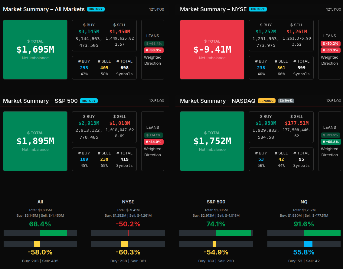The market-on-close flow opened the 12:50 early-close window with an end-of-month buy imbalance at +$1.695B, with $3.145B buy vs. $1.450B sell. From there, the auction held a steady buy-side tone, though it gradually decayed into the close.