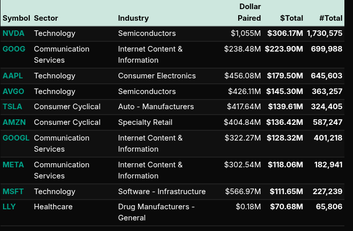 Sector flow was dominated by Technology ($1.033B total) and Communication Services ($566M) — both posting strong buy skews of +86.6% and +98.3%, respectively. Heavyweights led the tape: NVDA ($306M), GOOG/GOOGL ($224M / $128M), AAPL ($180M), MSFT ($112M), and META ($118M).