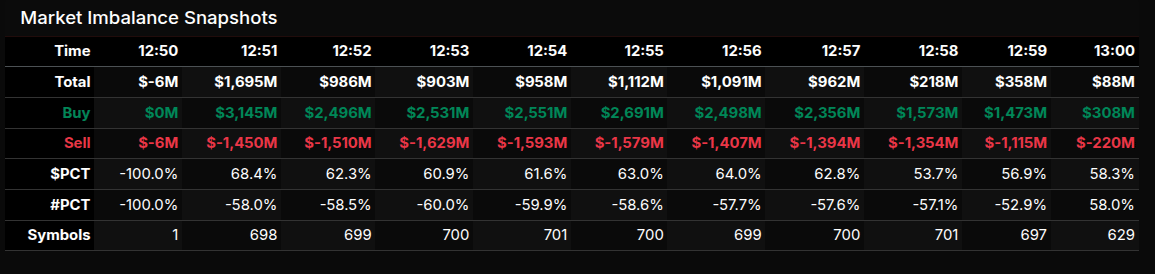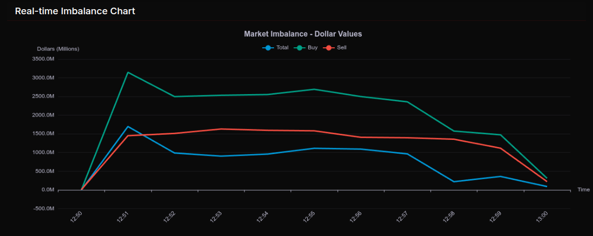 From 12:50 to 13:00, the time-series shows buy pressure peaking at 12:51 ($3.1B), then steadily fading toward $308M by 13:00. Total imbalance fell from $1.695B to just $88M, confirming that the early burst of demand was met with paired liquidity into the final prints. The lean percentages stayed tight, with most slices registering between +62% and +68%, reflecting directional buying but increasingly rotational behavior as paired sellers stepped in.