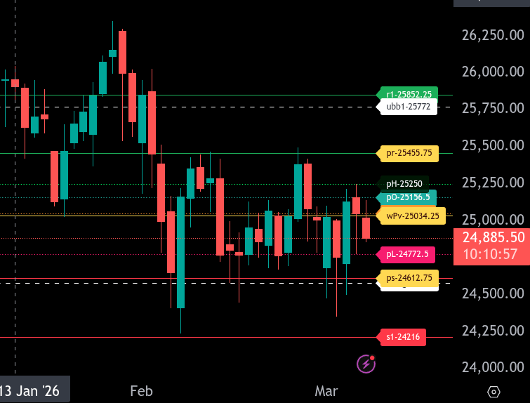 The bull/bear line for the NQ is at 25034.25. This is the key pivot for today. As long as price stays below it, the tone remains bearish and rallies into that area can be sold unless buyers can reclaim it and hold above it.