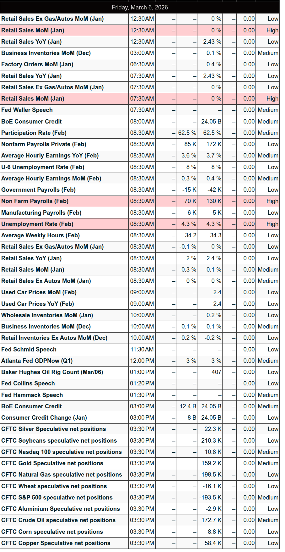 8:30am: Non-Farm Payrolls, Unemployment Rate, Avg Hourly Earnings, delayed Retail Sales