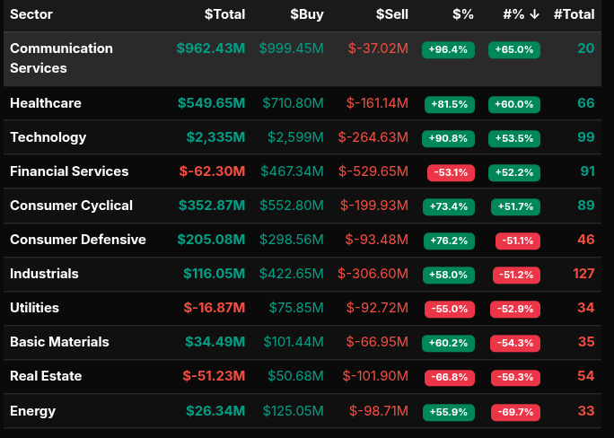 Technology led sector demand with a $2.335B net total and a 90.8% buy lean, while Communication Services posted 96.4%, another standout wholesale buy signal. Healthcare was also strong at 81.5%, and Consumer Cyclical came in at 73.4%. On the sell side, Real Estate registered -66.8%, marking a notable wholesale sell lean, while Utilities at -55.0% and Financial Services at -53.1% looked more rotational than outright liquidation.