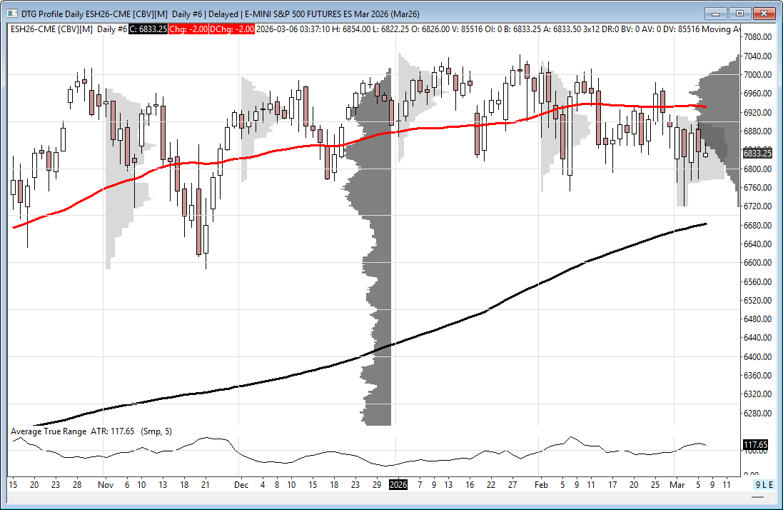 ES trading below the 50-day MA (6931) resistance and above 200-day MA (6683) support.