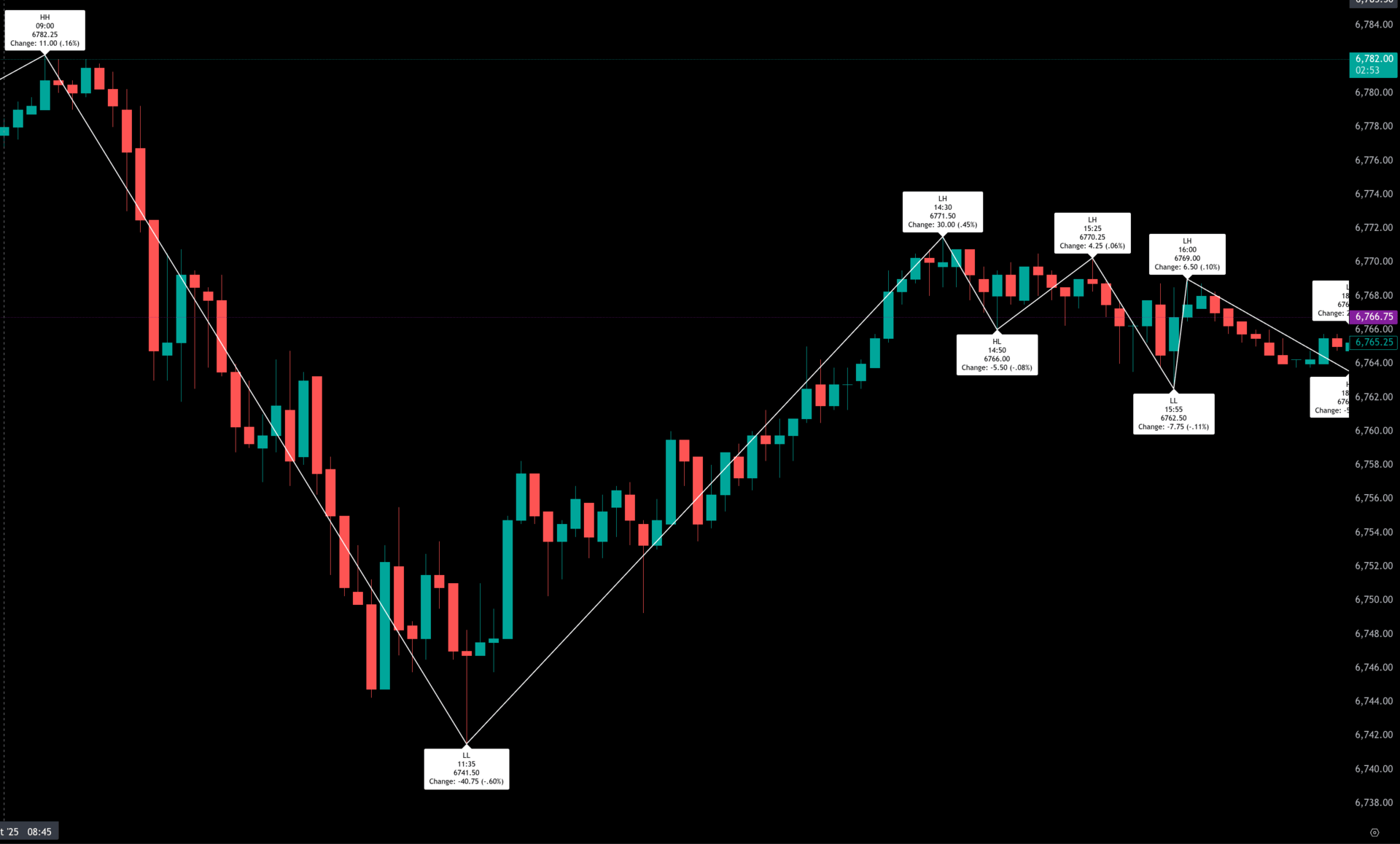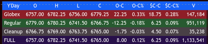 The regular session began at 6779.00, slightly above the overnight midpoint, but quickly sold off. By 11:35, ES printed a sharp low at 6741.50, down 37.5 points (-0.55%) from the open and establishing the day’s cash-session trough. From there, buyers staged a broad recovery, lifting futures to 6771.50 at 14:30. The rest of the afternoon was a tight 7-point chop of lower highs and finished the regular session at 6766.75, down 12.25 points (-0.18%) from the open but up 6.25 points (+0.09%) from the prior cash close.