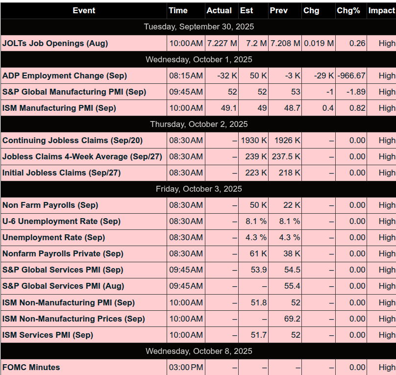 Government Shutdown: No end in sight. The September jobs report is likely delayed, with the BLS down to one active staffer. Political standoff continues over healthcare funding.